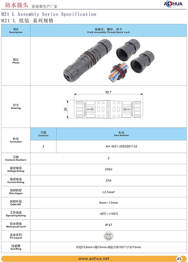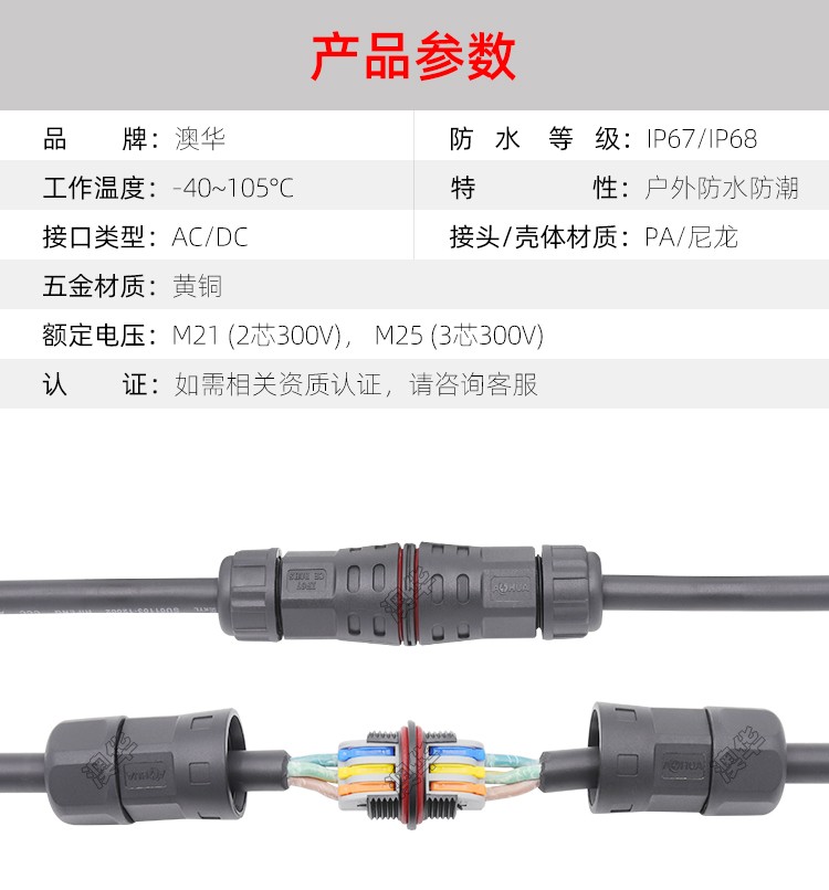 AHUA澳華公司專業(yè)生產LED防水插頭連接器、路燈模組分線盒、工控防水公母接頭、光伏航空插頭、新能源防水電源連接線、植物生長燈連接線、畜牧養(yǎng)殖連接線、汽車線束。工廠自有模具制造、電線電纜押出、大型注塑、五金制造,雙生產基地,可來圖來樣個性化定制,國家高新技術規(guī)模企業(yè)!