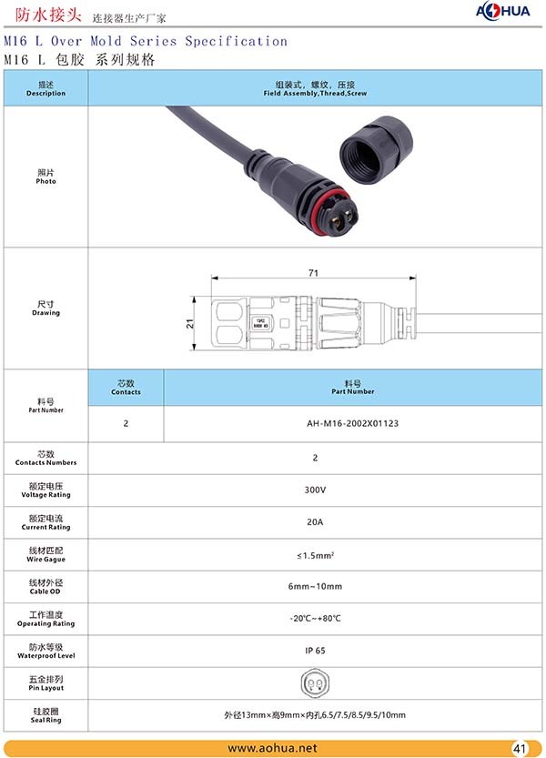 AHUA澳華公司專業生產LED防水插頭連接器、路燈模組分線盒、工控防水公母接頭、光伏航空插頭、新能源防水電源連接線、植物生長燈連接線、畜牧養殖連接線、汽車線束。工廠自有模具制造、電線電纜押出、大型注塑、五金制造,雙生產基地,可來圖來樣個性化定制,國家高新技術規模企業!