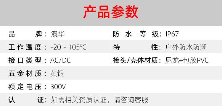 AHUA澳華公司專業(yè)生產(chǎn)LED防水插頭連接器、路燈模組分線盒、工控防水公母接頭、光伏航空插頭、新能源防水電源連接線、植物生長(zhǎng)燈連接線、畜牧養(yǎng)殖連接線、汽車線束。工廠自有模具制造、電線電纜押出、大型注塑、五金制造,雙生產(chǎn)基地,可來圖來樣個(gè)性化定制,國(guó)家高新技術(shù)規(guī)模企業(yè)!