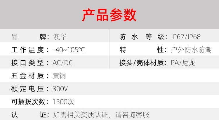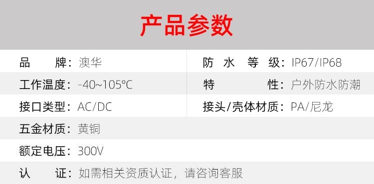 AHUA澳華公司專業(yè)生產LED防水插頭連接器、路燈模組分線盒、工控防水公母接頭、光伏航空插頭、新能源防水電源連接線、植物生長燈連接線、畜牧養(yǎng)殖連接線、汽車線束。工廠自有模具制造、電線電纜押出、大型注塑、五金制造,雙生產基地,可來圖來樣個性化定制,國家高新技術規(guī)模企業(yè)!