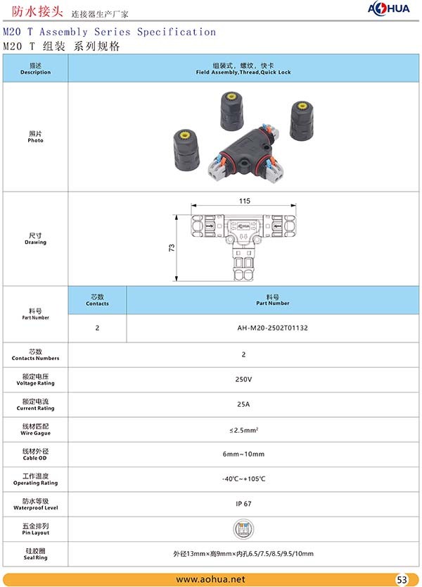 AHUA澳華三通自鎖T型防水連接器智慧路燈T型防水轉接頭2芯