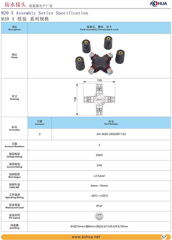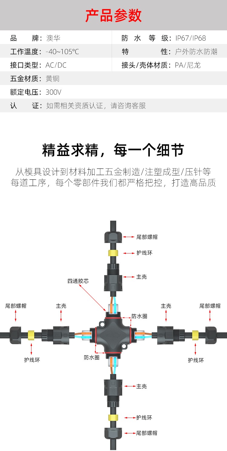 AHUA澳華公司專業(yè)生產LED防水插頭連接器、路燈模組分線盒、工控防水公母接頭、光伏航空插頭、新能源防水電源連接線、植物生長燈連接線、畜牧養(yǎng)殖連接線、汽車線束。工廠自有模具制造、電線電纜押出、大型注塑、五金制造,雙生產基地,可來圖來樣個性化定制,國家高新技術規(guī)模企業(yè)!