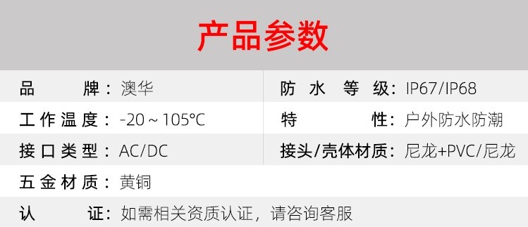 AHUA澳華公司專業生產LED防水插頭連接器、路燈模組分線盒、工控防水公母接頭、光伏航空插頭、新能源防水電源連接線、植物生長燈連接線、畜牧養殖連接線、汽車線束。工廠自有模具制造、電線電纜押出、大型注塑、五金制造,雙生產基地,可來圖來樣個性化定制,國家高新技術規模企業!
