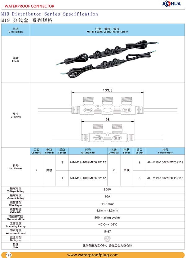 AHUA澳華M19植物燈條形模組戶外防水連接器公母防水插頭