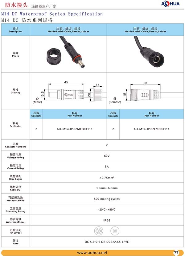 AHUA澳華投光燈M14DC防水線顯示屏防水接頭防水連接器