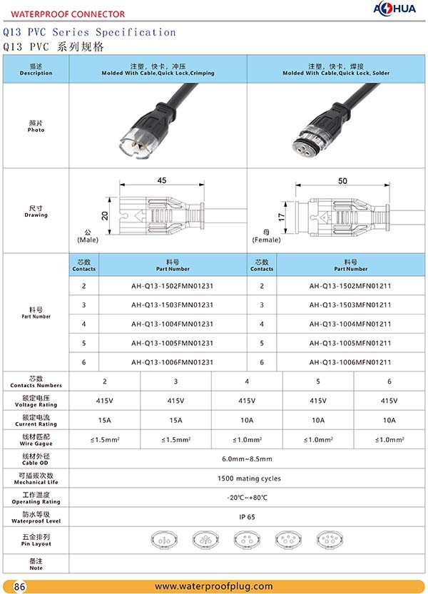 AHUA澳華2/3芯Q13尼龍快速插拔防水連接器護欄管瓦楞燈防水插頭線