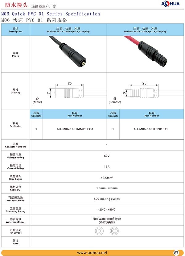 AHUA澳華M06PVC帶線接頭單芯小功率信號便攜插頭包膠注塑連接線