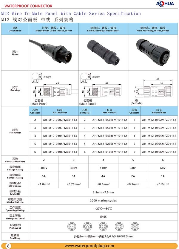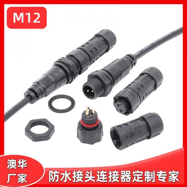 AHUA澳華防水插頭M12前裝公面板LED電源防水接頭連接器