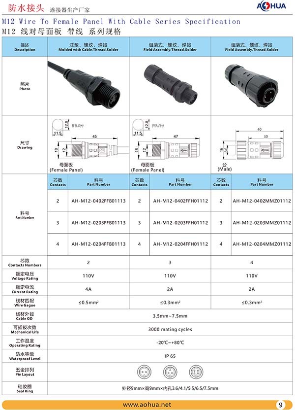 AHUA澳華M12連接器面板式太陽能控制器護欄管防水接頭