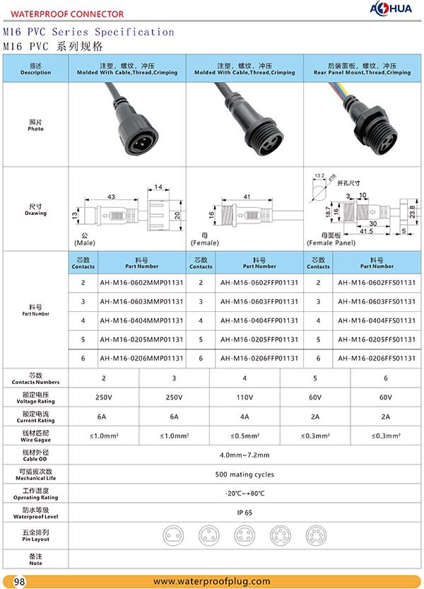 AHUA澳華面板M16PVC防水接頭線養殖設備線纜防水插頭