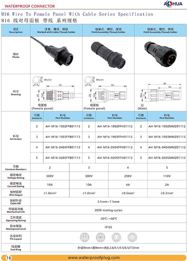AHUA澳華M16前置母面板養殖場防水連接器新能源公母接頭